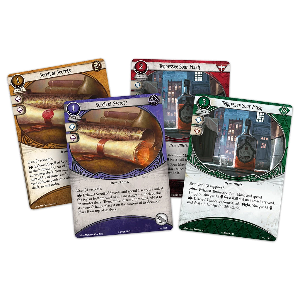 At first glance, several of the player cards featured in For the Greater Good may look familiar. In The Secret Name, the Arkham Horror LCG broke the boundary between player factions by introducing player cards like that belonged to multiple classes. Now, as your investigators continue to gain experience from their research into Arkham’s secret history, you will have the chance to upgrade these cards into more powerful versions that fit into classic, single-class categories. Each version of these upgraded cards feature distinct art pieces and abilities that play into the core focuses of their classes, growing with your investigators as their search for answers continue.