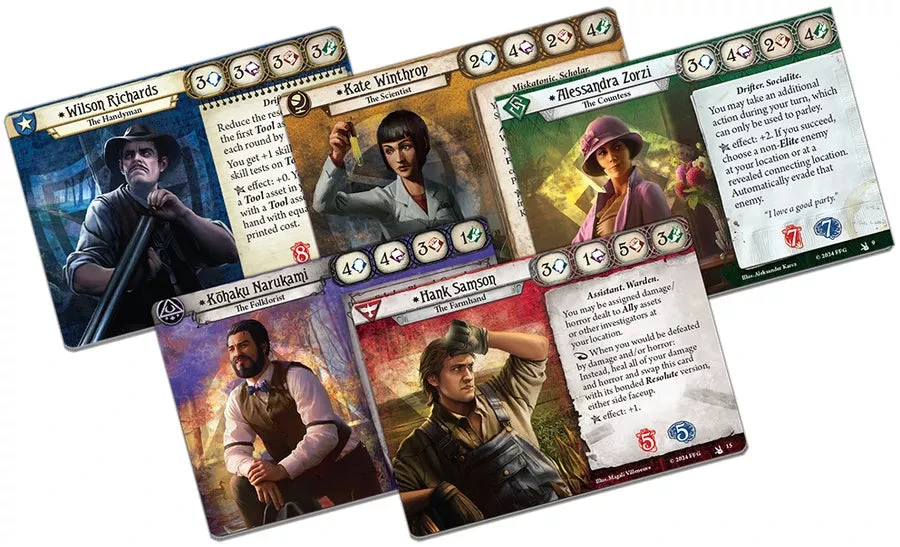 The Feast of Hemlock Vale Investigator Expansion features five new investigators for Arkham Horror: The Card Game and adds a wealth of new player cards and options for deckbuilding, including brand-new bonded cards and cards that make use of bless and curse tokens. Use the right tool for the job as the handyman, Wilson Richards; build the ultimate laboratory as the scientist, Kate Winthrop; smooth-talk your way out of danger as the countess, Alessandra Zorzi; bring balance to chaos as the folklorist, Kōhaku Narukami; and throw yourself into danger to protect others as the farmhand, Hank Samson.
