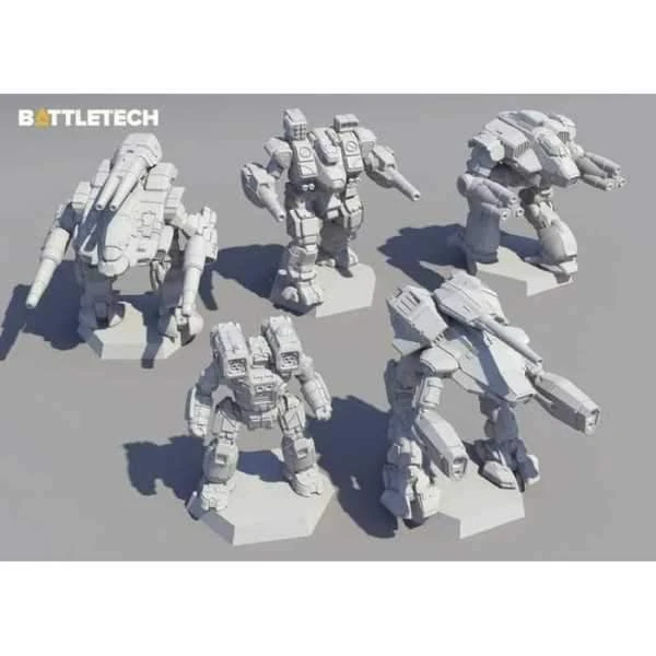 The Clan Heavy Star is a collection of five plastic miniatures for use in the classic BattleTech tabletop and Alpha Strike games. The box also provides five dry-erase cards, which are intended to directly support Alpha Strike gameplay, and five new Clan Pilot Cards. The five BattleMechs available in the Clan Heavy Star are the Behemoth, Hunchback IIC, Marauder IIC, Supernova and Warhammer IIC.