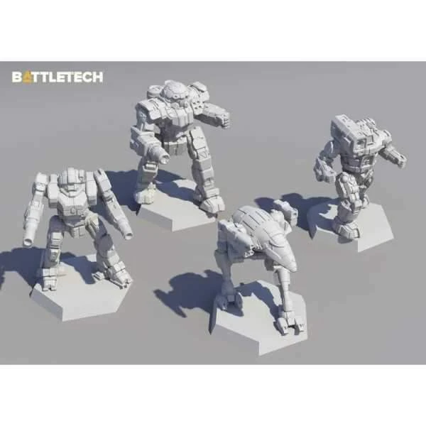 The Inner Sphere Urban Lance is a collection of four plastic miniatures for use in the classic BattleTech tabletop and Alpha Strike games. The box also provides four dry-erase cards, which are intended to directly support Alpha Strike gameplay, and four new Clan Pilot Cards. The four ‘Mechs available in the lance pack are the Enforcer, Hunchback, Raven and Victor.
