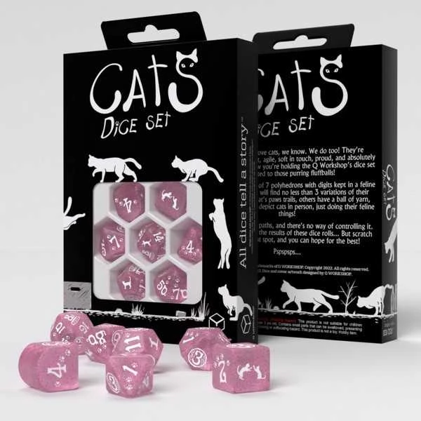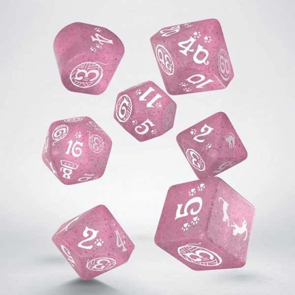 The most fluffy of furs! Q WORKSHOP presents the never-before-seen CATS Dice Set: Daisy. This totally new design shows playful cats and their everyday activities! Each of the 7 dice has different felines posing on the highest face. The shimmering-pink material and white paintings bring about cats’ soft fur, which simply begs to be petted. Give them attention, and they’ll make it worthwhile!