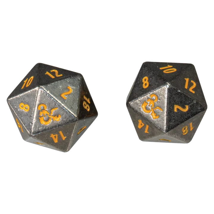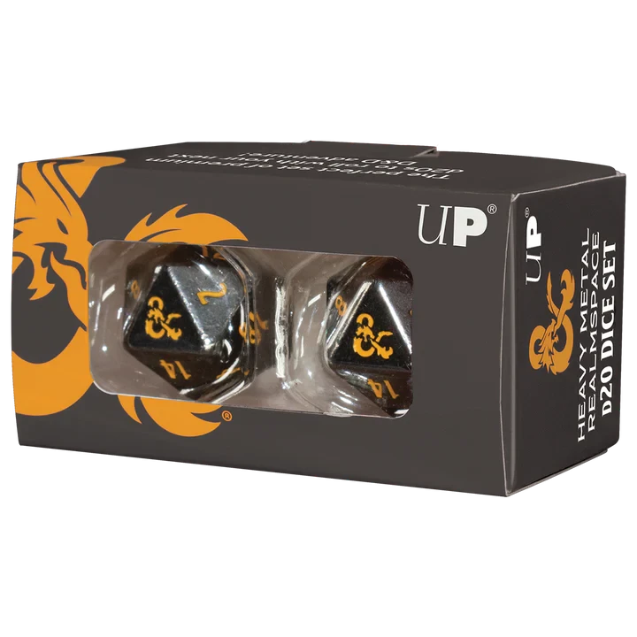 Roll with advantage and ward off enemies on your next adventure with the commanding roll of these official Dungeons & Dragons Heavy Metal Dice! Made from the same heavy zinc alloy material as the Heavy Metal 7 RPG Dice Sets, rolling these dice will send a rumble through the realm! This set includes two 20-sided dice featuring the iconic Dungeons & Dragons logo in place of the number 20.