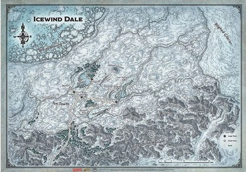 A map of the Icewind Dale region for D&D Icewind Dale: Rime of the Frostmaiden sourcebook. Trapped in winter’s cold embrace, nomadic humans follow herds of reindeer through their migrations, while others dare the treacherous waters of the Sea of Moving Ice in search of fish, seals, walruses, and whales to sustain them. Dwarves dig into the earth to seek shelter and mine for iron. Meanwhile, folk descended from foolhardy and treasure-mad immigrants eke out meager lives in Ten-Towns, which can barely hold back the wind, let alone marauding orcs, giants, and fierce tundra yeti. Despite the unnatural cold and other dangers, people still brave the journey to reach this harsh winterscape, searching for opportunity and adventure.