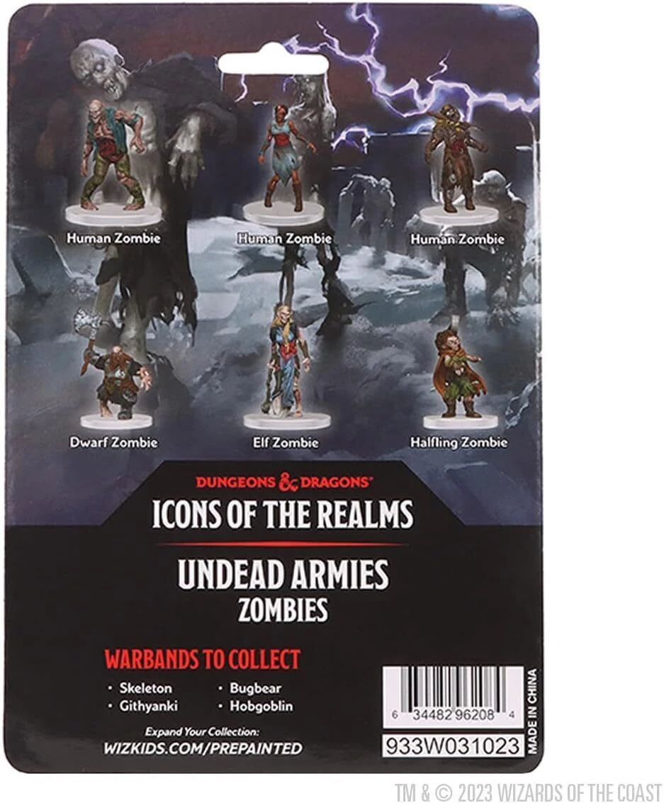 The D&D Icons of the Realms: Undead Armies – Zombies contains six of the iconic D&D foe for your adventurers to battle! Dungeon Masters can quickly build new encounters for their players with the awesome mix of Zombies, to keep play sessions exciting over multiple campaigns. With its non-blind packaging, building a quick Zombies army is quick and simple!
