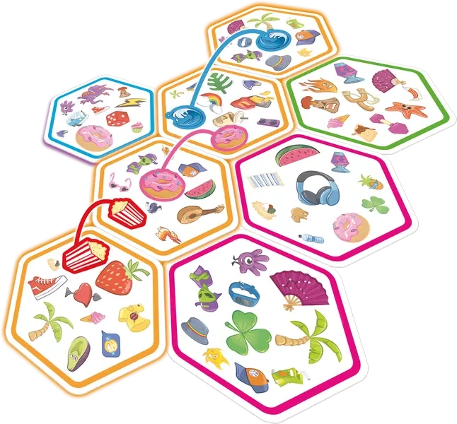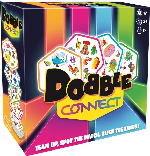 Fun, fast-paced and frantic: Dobble Connect is THE ultimate reflex game for a wild time! Be the fastest team to connect 4 cards of your color in a row! To line up new cards, name the only common symbol between the cards in your hands and those already laid down. Everyone plays at the same time, so watch for the other teams and block them with your cards before they do!