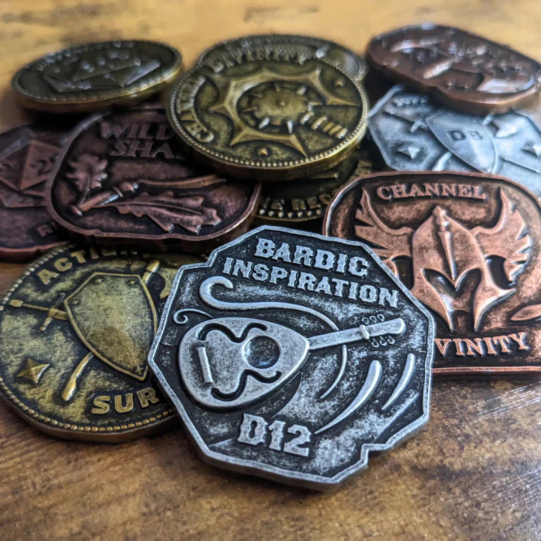 54 possible dice sets available, 18 different coins and 5 different color dice bags
