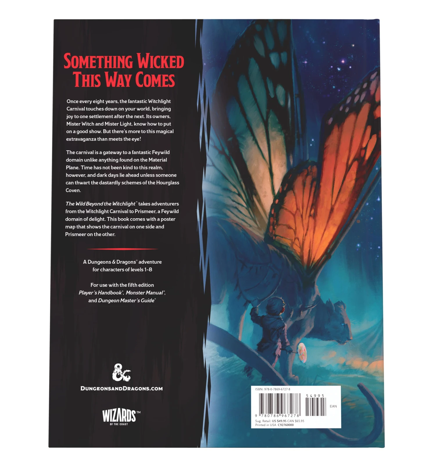 The Wild Beyond the Witchlight takes adventurers from the Witchlight Carnival to Prismeer, a Feywild domain of delight, and is designed for characters of levels 1–8. This book comes with a poster map that shows the carnival on one side and Prismeer on the other.
