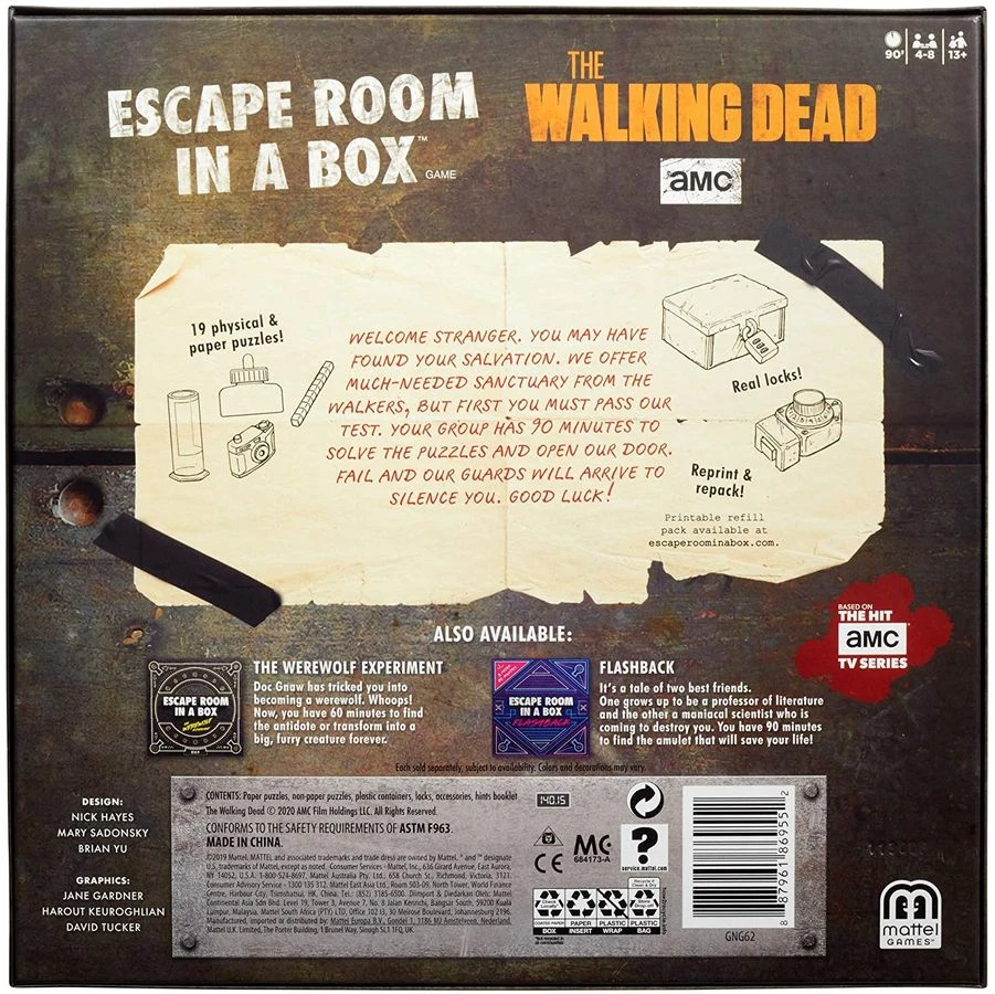 Escape Room in a Box: The Walking Dead puts you and your friends into the dangerous world of AMC’s The Walking Dead TV show. You and up to seven other players have 90 minutes to solve puzzles, crack codes, and unlock real, physical locks in order to finally open the giant locked door, gain access to the community, and win the game.