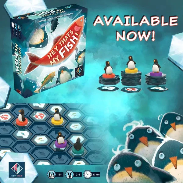 In Hey, That’s My Fish!, players want to catch as many fish as possible with their waddle of penguins. Each turn, a player moves one penguin in a straight line over hex-shaped ice tiles with 1, 2 or 3 fish on them. The player then collects the hex from where the penguin started its movement from the table, thereby creating a gap which penguins can’t cross on future turns. When a penguin can’t move, it’s removed from play with its owner claiming the tile on which it stands. The player who collects the most fish wins.