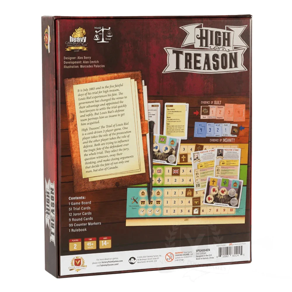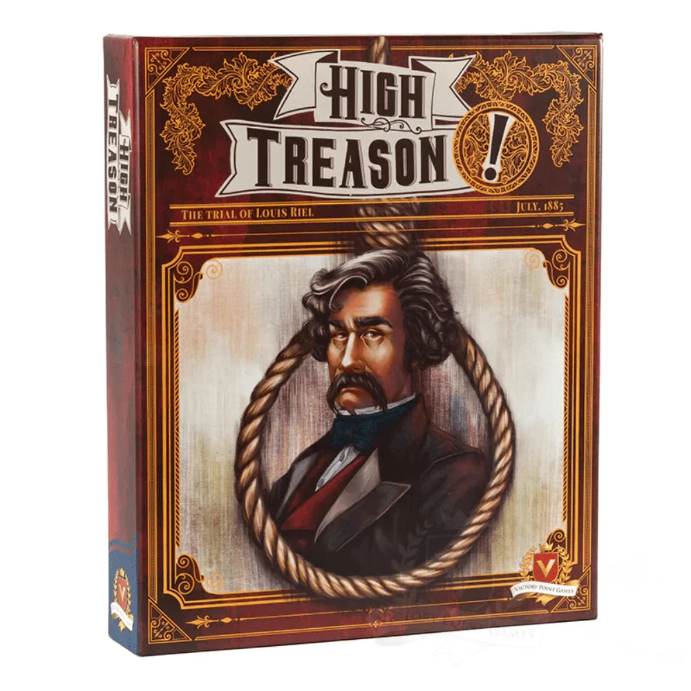 High Treason! The Trial of Louis Riel is a card-driven 2-player game. One player takes the role of the prosecution and the other player takes the role of defense. Both are trying to influence the tragic fate of the defendant over the whole trial. They select the jury, question witnesses sway their thinking, and make closing arguments that decide the fate of not only one man but also of Canada.
