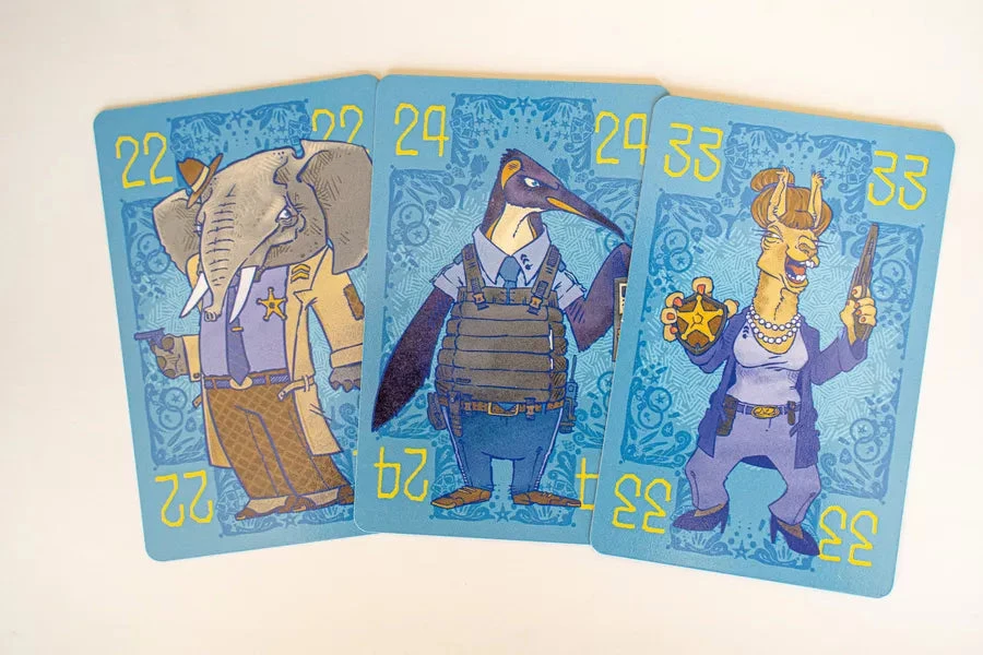 Gather enough evidence on one criminal organization to convict them when the game concludes after ten rounds; in game terms, by having exactly three of a suit, you earn 10 bonus points. Ten bonus points are also awarded to those who acquire criminal cards of all five suits. If you investigate too aggressively and grab the fourth card of a suit, those criminals will sense a rat and you’ll scare them underground, thereby losing all of those cards. The player with the most points at the end of the game wins.