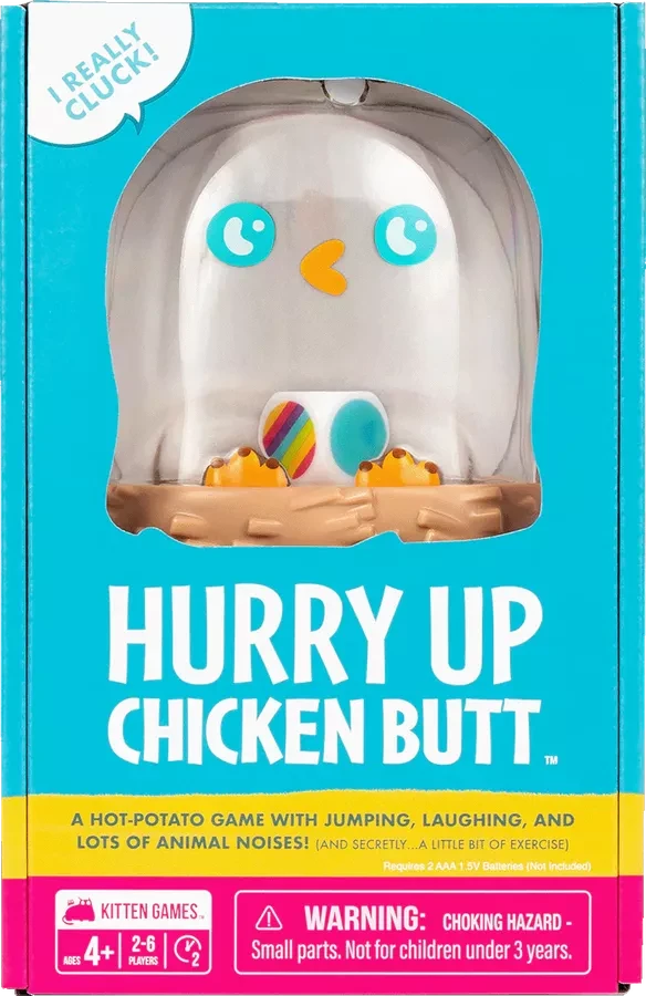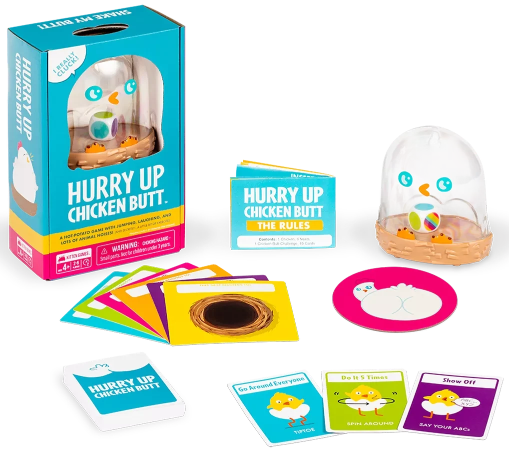Hurry Up Chicken Butt is akin to a game of “hot potato”, but with a chicken-shaped shaker that clucks and holds the dice, with players needing to complete silly challenges in order to pass the chicken.