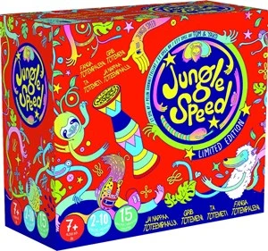 In Jungle Speed, you must rely on your keen sense of observation and quick reflexes. It requires a steady hand — which can be hard to maintain during the many fits of maniacal laughter! The wooden Totem sits in the middle of the table, waiting for the player with the fastest reflexes to snatch it up and win the game. With Artwork by Bertone.
