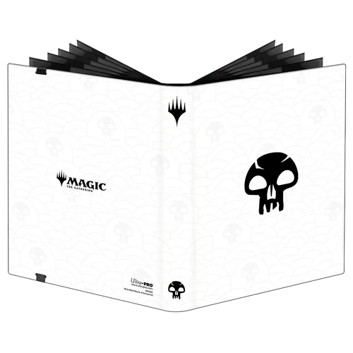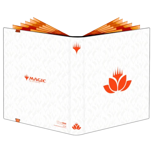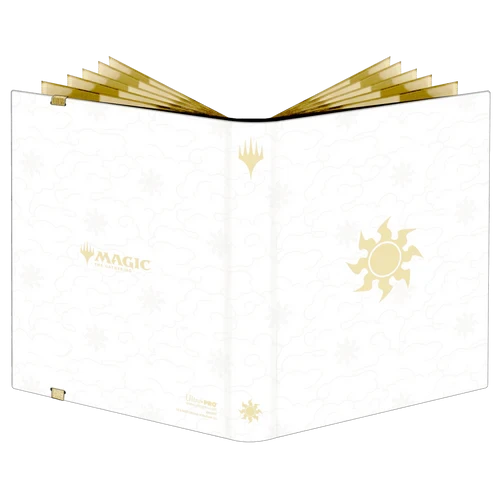 This 9-Pocket PRO-Binder for Magic: The Gathering features a white leatherette material with the iconic symbol and matching elastic strap. Store and protect up to 360 standard size trading cards double-sleeved in Ultra PRO Deck Protector® sleeves. Each pocket page is backed with a low-friction material to give cards a classic, framed look. Side-loading pockets and low-friction material help keep cards in place. All materials are archival-safe, acid-free, and non-PVC for premium protection.