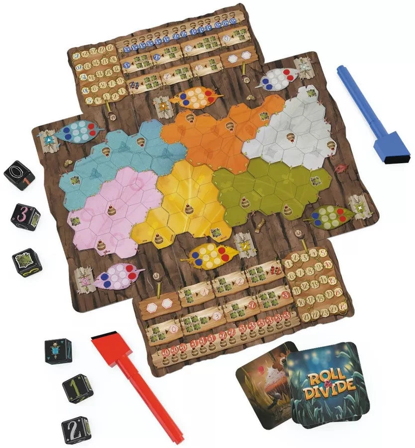 Each player controls a colony of ants in Marabunta. On a turn, the active player rolls the six dice, then splits them into two groups. The opponent chooses and uses the dice in one of the groups, then the active player uses the remaining dice.