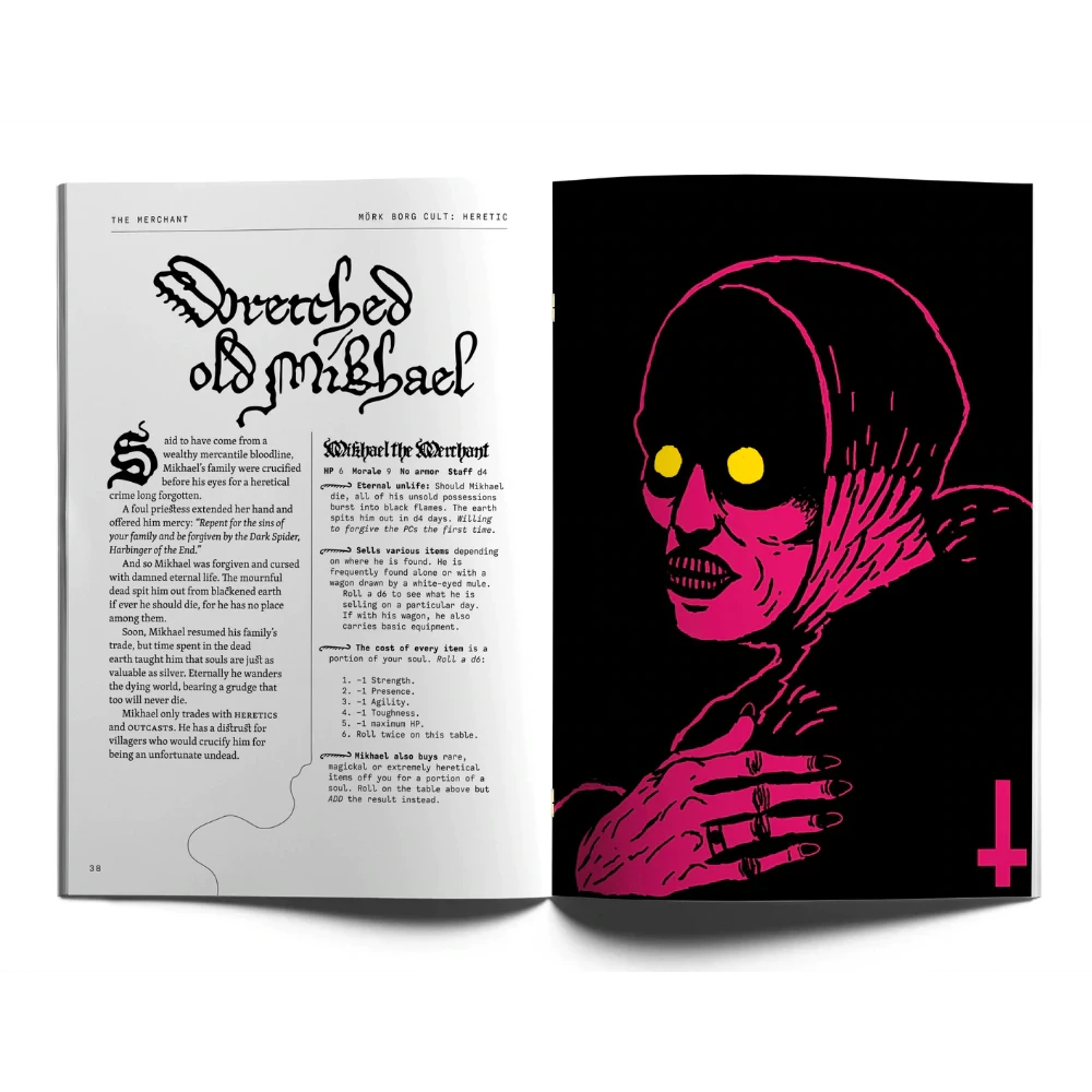 MÖRK BORG CULT: HERETIC is a zine of community-made misadventure and malice, for use with MÖRK BORG or other rules-light dark fantasy games. In this heinous tome of curses and hexes you’ll find: