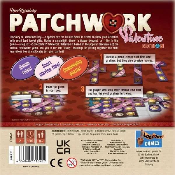 February 14, Valentine’s Day – a special day for all love birds: it is time to show your affection with small (and large) gifts. Maybe a candlelight dinner, a flower bouquet, or – like in this game – a big box of chocolates? Patchwork Valentine is based on the popular mechanics of the classic Patchwork game. Are you in for this “lovely” challenge of putting together the most marvelous box of chocolates for your darling?