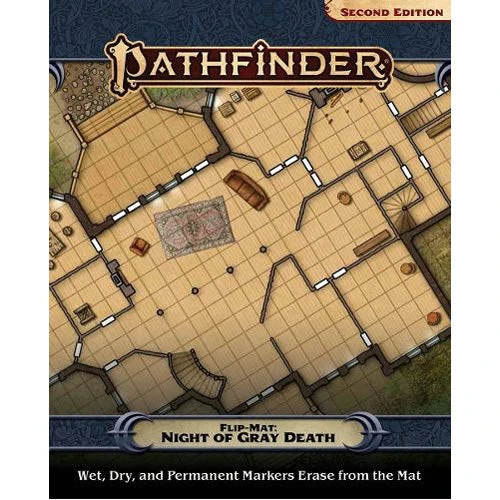 Bring horror and conspiracy to life on your tabletop with this double-sided full-color Flip-Mat featuring key encounter locations from the Pathfinder Second Edition adventure Night of the Gray Death on either side! One side depicts a crumbled vault and the other side shows a ballroom suitable an eerie masquerade, with alcoves and nooks for scheming or skullduggery! Don’t waste your time sketching when you could be playing. With Pathfinder Flip-Mat: Night of the Gray Death, adventure and intrigue await! Pathfinder Flip-Mat: Night of the Gray Death measures 24″ x 30″ unfolded, and 8″ x 10″ folded. A Flip-Mat’s coated surface can handle any dry erase, wet erase, or even permanent marker. Usable by experienced GMs and novices alike, Pathfinder Flip-Mats fit perfectly into any Game Master’s arsenal! On tabletops across the world, the Flip-Mat Revolution is changing the way players run their fantasy roleplaying games! Why take the time to sketch out ugly scenery on a smudgy plastic mat when dynamic encounters and easy cleanup is just a Flip away?