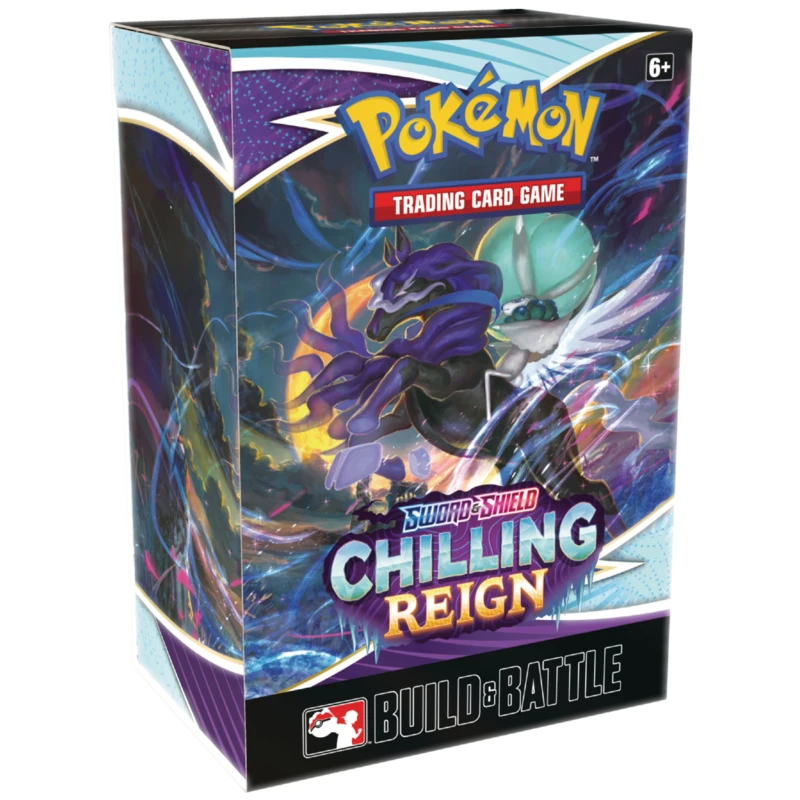 The Pokémon Chilling Reign Build & Battle Box gives you the first chance to find Ice Rider Calyrex, and Shadow Rider Calyrex, as well as the Galarian forms of Articuno, Zapdos, and Moltres. The box itself holds four Sword & Shield Chilling Reign booster packs, a 23-card Evolution pack featuring key cards from current and prior sets, including one of four alternate-art promo cards, and a deck-building tip sheet.