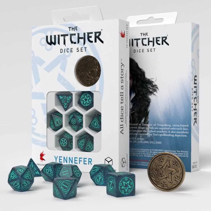 Inspired by the Witcher franchise, this set of seven high-quality polyhedral dice comes with a metal coin featuring a depiction of the one of the main characters.