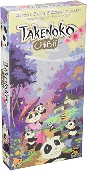 Takenoko: Chibis includes a miniature of the female panda, nine different tiles for the baby pandas, six plot tiles, 18 cards, and 17 bamboo pieces.