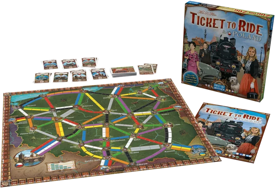 Ticket to Ride Map Collection: Volume 6½ – Poland, which debuted solely on the Polish market in 2019 as Wsiąść do PociÄ…gu: Polska, challenges players to create connections between Poland’s neighboring countries, such as Germany, Ukraine, and the Czech Republic. In addition to connecting cities and completing tickets in the usual way of other Ticket to Ride games, your routes can reach border crossings and thus connect neighboring countries. If you manage to create such a connection on your turn, say, building a track so that you have a connected line from Ukraine to Germany, you draw the top point card from the stack for each of these two countries. Their point value is arranged in descending order, which means that the players who are the first to draw cards receive more points. If you later connect this network to the Czech Republic, then you’d draw the top card from each of the three countries’ card stacks — assuming that a country’s cards haven’t all been claimed, of course.