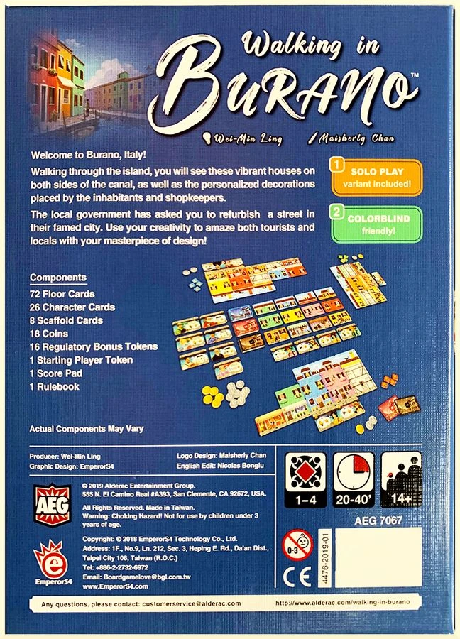 Walking in Burano is a family game. Players place the Floor Cards in order to receive a visit from different characters. They will score points based on the various symbols on the houses. To be the player with the most points at the end of the game.