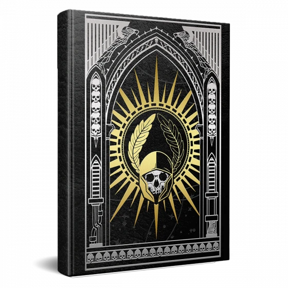 Introducing the Imperium Maledictum: Collector’s Edition – a stunning tome that demands pride of place on any bookshelf! This exclusive, limited edition volume is expertly crafted with a luxurious black faux leather cover, emblazoned with a striking gold and silver foiled icon that pays tribute to the legendary Lord Solar Macharius. The debossed starfield adds an extra subtle touch to the design, while the book block is perfected with gleaming gold gilt edges.