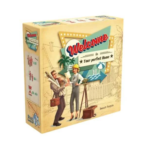 Welcome To… plays like a roll-and-write dice game in which you mark results on a score-sheet…but without dice. Instead you flip cards from three piles to make three different action sets with both a house number and a corresponding action from which everyone chooses one. You use the number to fill in a house on your street in numerical order. Then you take the action to increase the point value of estates you build or score points at the end for building parks and pools. Players also have the option of taking actions to alter or duplicate their house numbers. And everyone is racing to be the first to complete public goals. There’s lots to do and many paths to becoming the best suburban architect in Welcome To…!